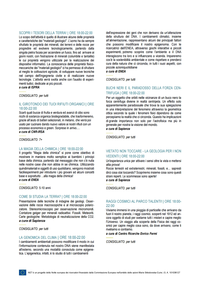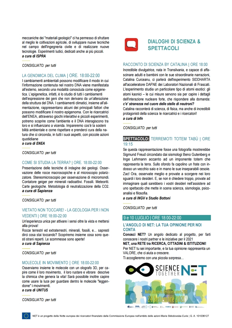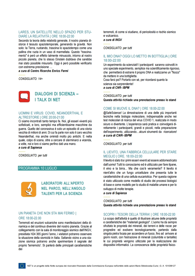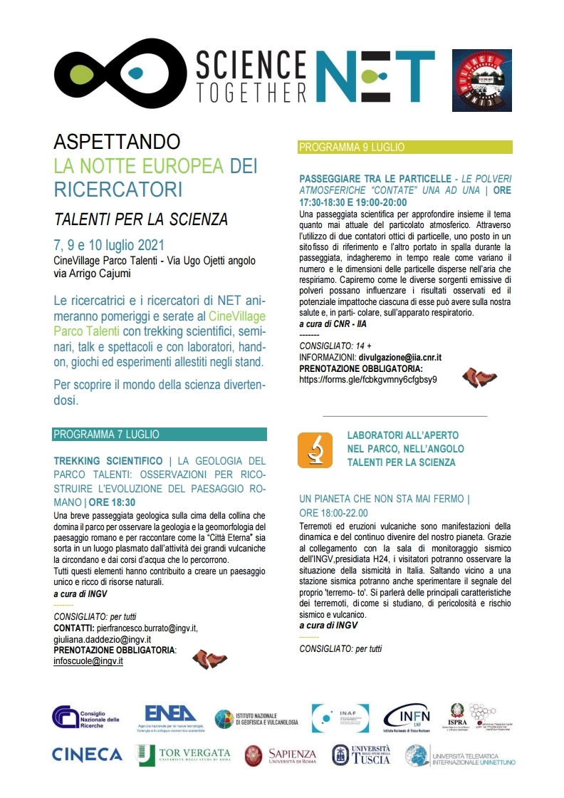 Le ricercatrici e i ricercatori di NET animeranno pomeriggi e serate al CineVillage Parco Talenti con trekking scientifici, seminari, talk e spettacoli e con laboratori, hand on, giochi ed esperimenti allestiti negli stand.